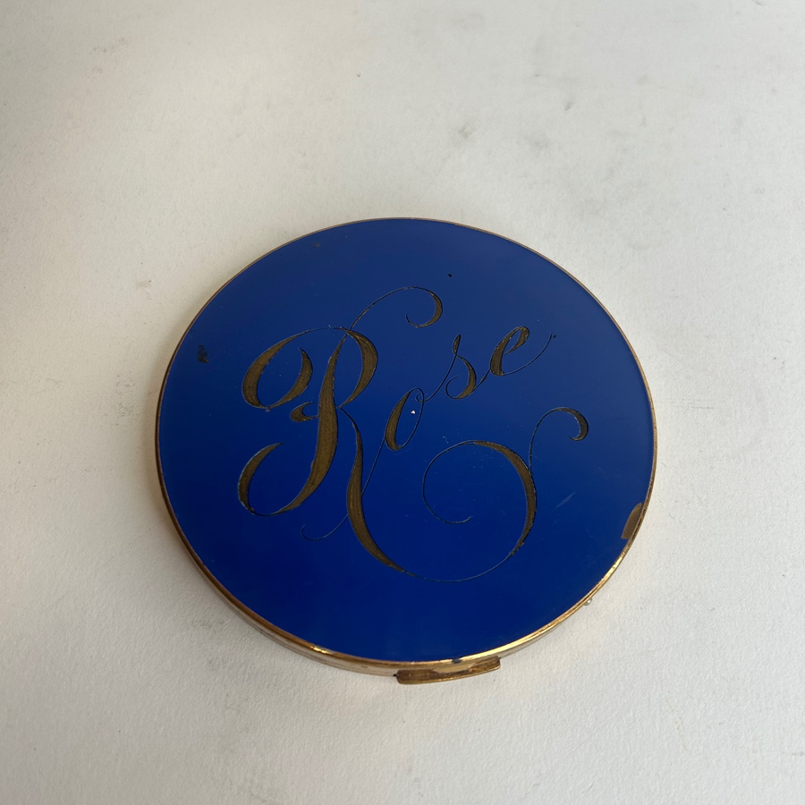 round vintage blue & gold compact, etched word ROSE on front, with flat powder sponge **NO ACTUAL MAKEUP INSIDE**