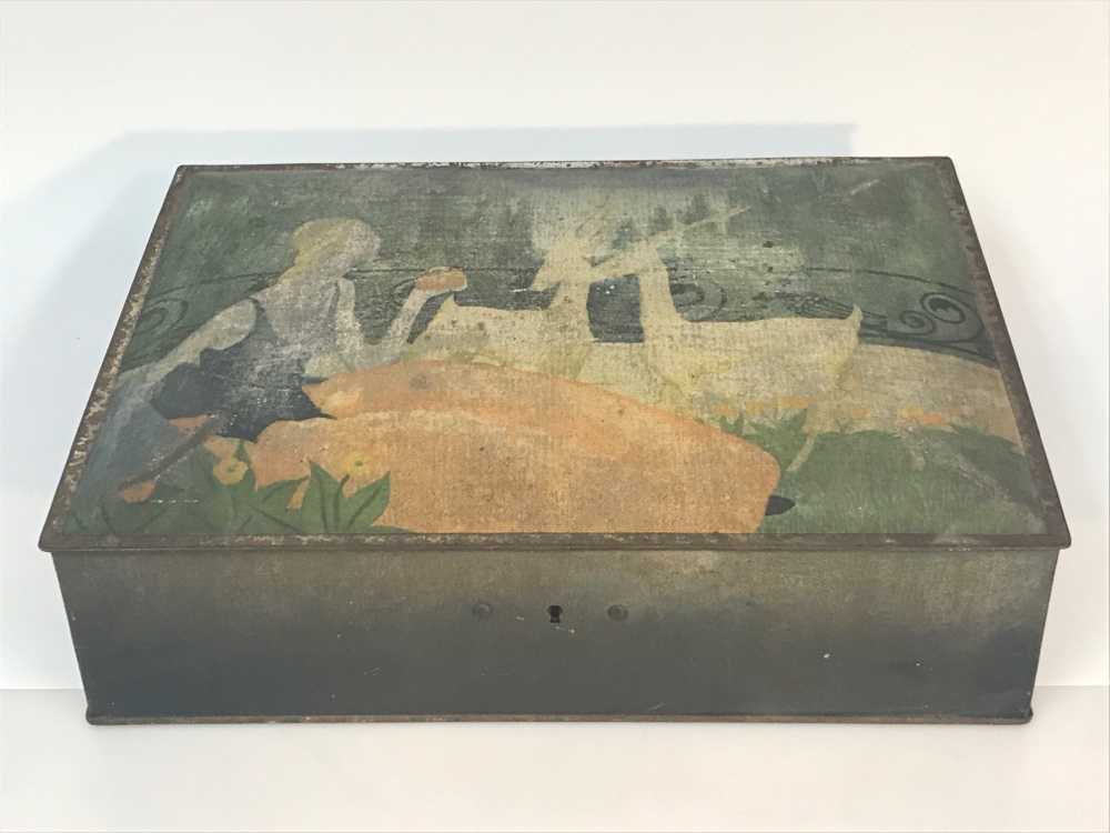 Vintage metal box with enamel image on lid of woman feeding antelope, heavy patina and detailed gold interior.